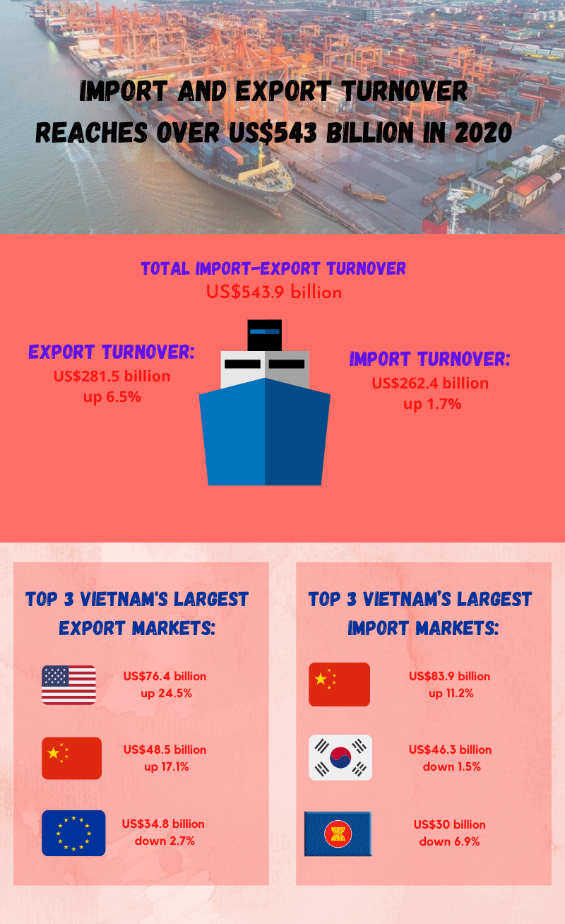 VOV.VN - 2020 witnessed Vietnamese import-export turnover reach over US$543,9 billion, a year-on-year increase of 5.1%, according to the General Department of Customs.