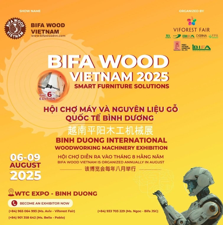 VOV.VN - More than 100 leading enterprises from around the world are set to participate in the sixth Binh Duong International Woodworking Machinery Exhibition (BIFA WOOD VIETNAM 2025), slated for August 6 - 9 in Ho Chi Minh City.