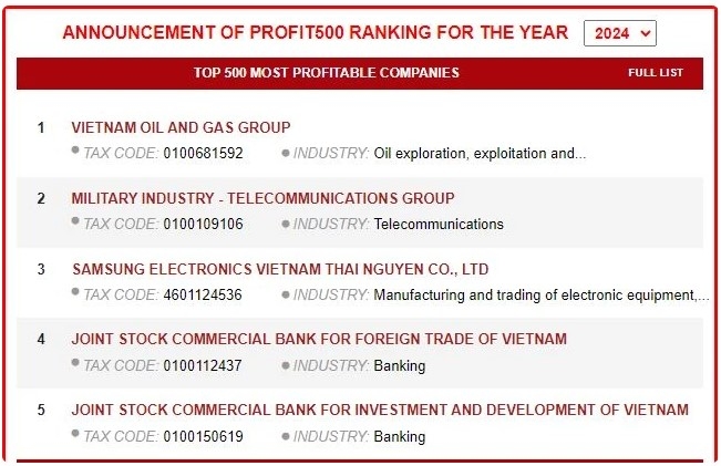 Leading the 2024 PROFIT500 ranking are prominent enterprises such as the Vietnam Oil and Gas Group (PetroVietnam), the Viettel Military Industry and Telecoms Group, Samsung Electronics Vietnam Thai Nguyen, Joint Stock Commercial Bank for Foreign Trade of Vietnam (Vietcombank), and Joint Stock Commercial Bank for Investment and Development of Vietnam (BIDV).