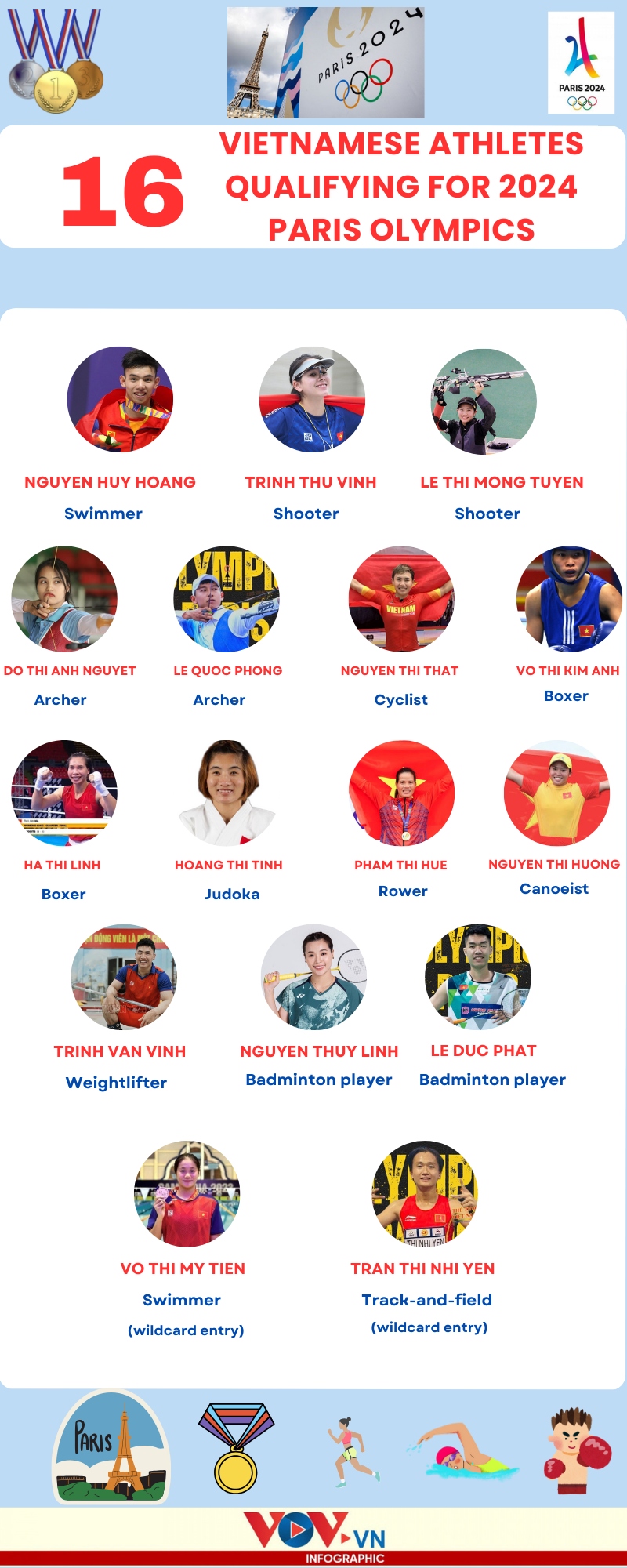 VOV.VN - To date, 16 Vietnamese athletes have been confirmed to compete at the 2024 Paris Olympics including two wildcard entries in track-and-field and swimming.