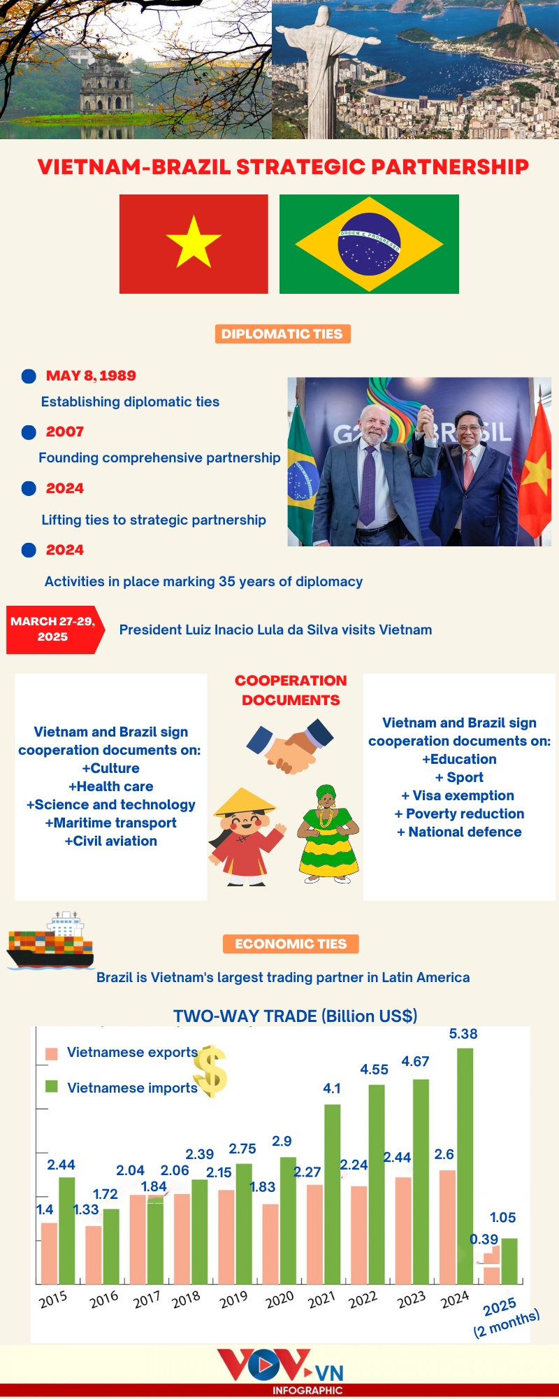 VOV.VN - Brazilian President Luiz Inacio Lula da Silva is making an official visit to Vietnam from March 27 to 29 to concretise the 2024 Strategic Partnership between the two countries. Let’s look at major milestones in bilateral relations.