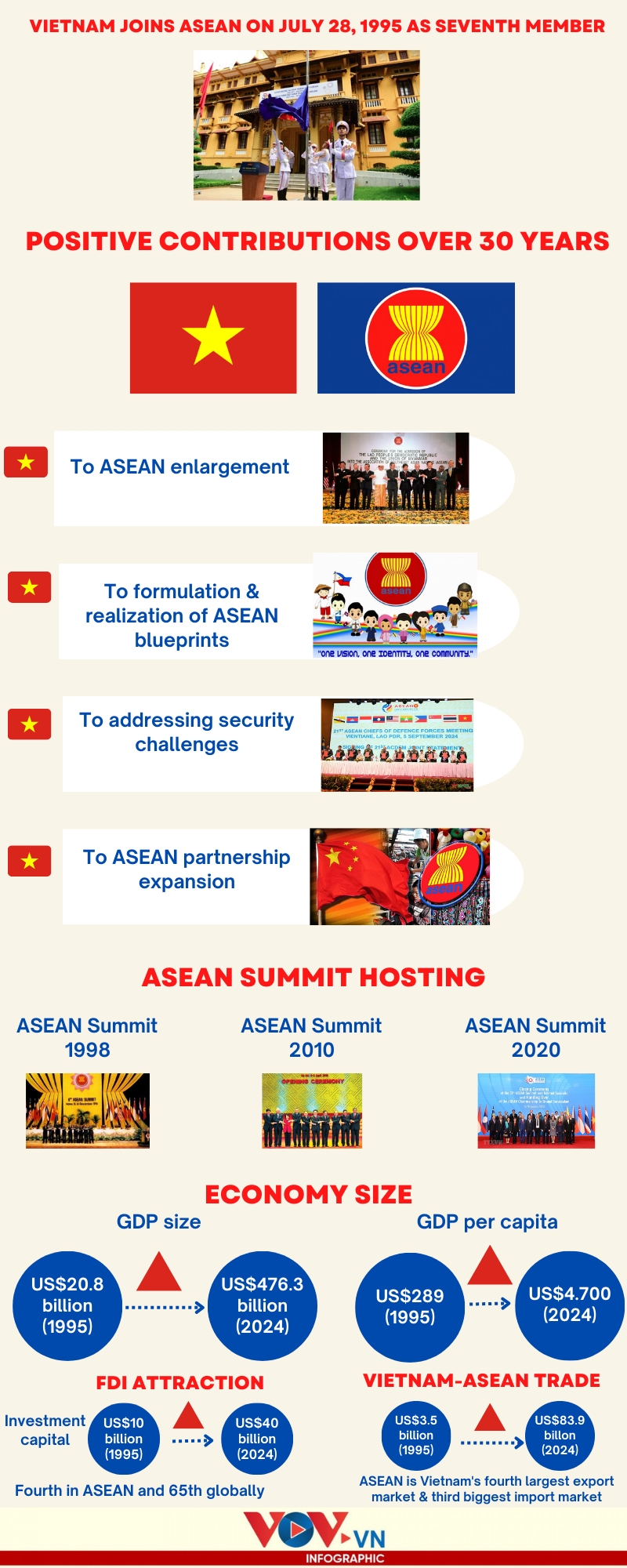 VOV.VN - Since joining ASEAN on July 28, 1995, Vietnam has promoted its role as a proactive, responsible member of the bloc, making substantial contributions to its overall development.