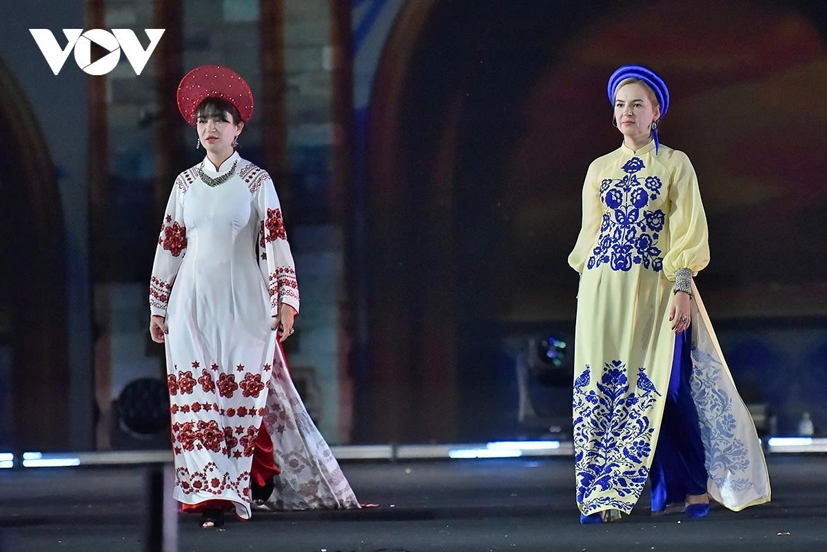 VOV.VN - Four ambassadors’ spouses from the Czech Republic, Japan, Ukraine, and the United States showcased a collection of Áo Dài (traditional Vietnamese long dress) designed by Anh Thu during an international traditional costume show in Hanoi on October 11.