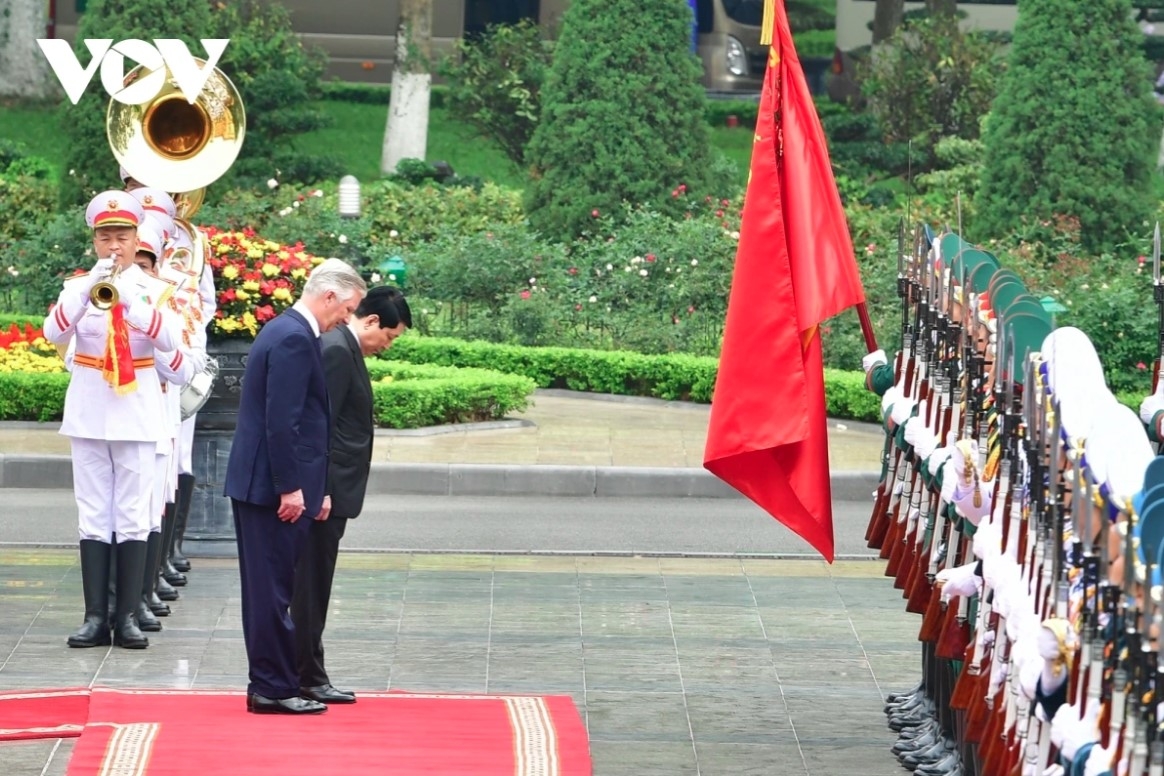 VOV.VN - A welcome ceremony hosted by State President Luong Cuong and his spouse for King Philippe and Queen Mathilde of Belgium was held at the Presidential Palace in Hanoi on April 1.