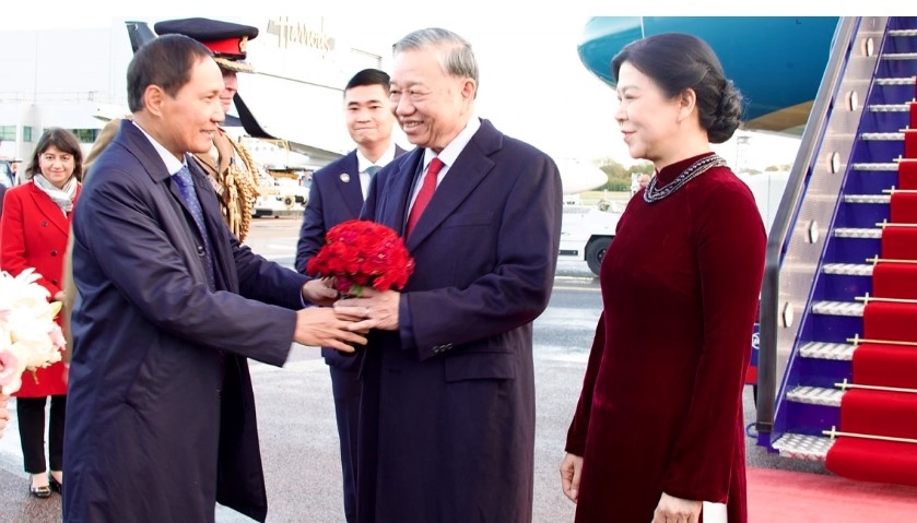 Those welcoming Party General Secretary To Lam, his spouse, and the delegation at the airport were British Parliamentary Under-Secretary of State for Indo-Pacific Seema Malhotra, Vietnamese Ambassador to the UK Do Minh Hung, Stephan Walton from the UK Foreign, Commonwealth and Development Office, and British Ambassador to Vietnam Ian Frew, along with other embassy staff.