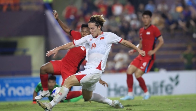 In the 68th minute, Thanh Nhan’s effort inside the penalty area struck the crossbar. Finally, in the 79th minute, a left-wing attack saw Phi Hoang deliver a precise cross, and midfielder Van Thuan rose to head the ball past the Singapore keeper, securing a vital goal.